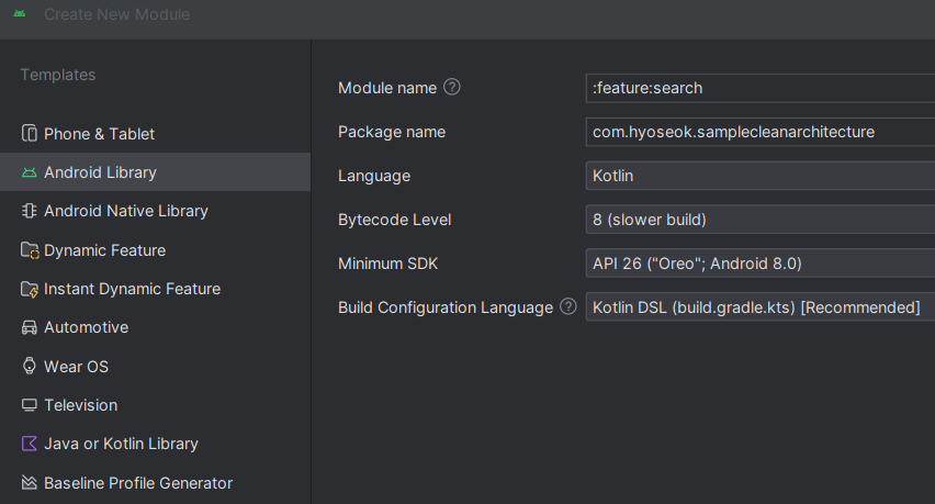 추가로 알아야할것은 Module name 인데 :feature:search 로 만들면 feature 라는 모듈이 생기고 그 아래에 search 라는 하위 모듈이 생긴다. 또 다시 :feature:main 으로 만들면 feature 모듈 아래에 main 이라는 하위 모듈이 추가된다.