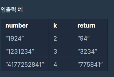 문자열 형식으로 숫자 number와 제거할 수의 개수 k가 solution 함수의 매개변수로 주어집니다. number에서 k 개의 수를 제거했을 때 만들 수 있는 수 중 가장 큰 숫자를 문자열 형태로 return 하도록 solution 함수를 완성하세요.